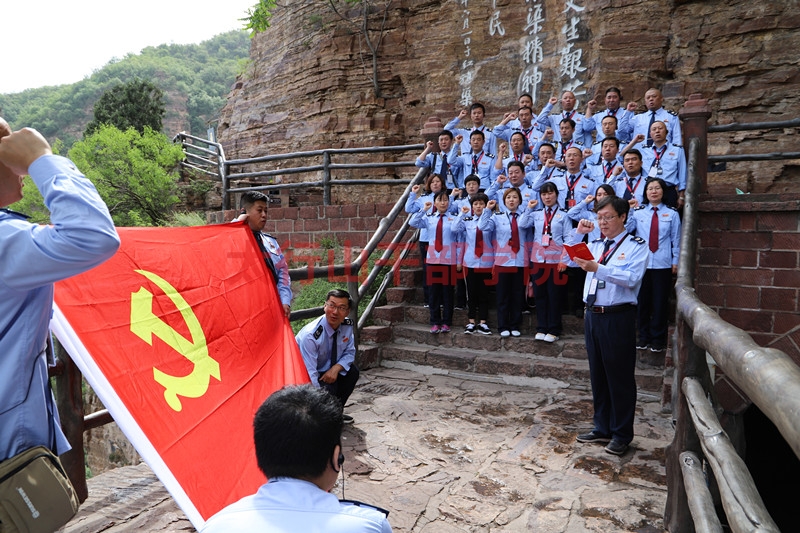 學(xué)員們踏上350米的廊橋——“紅飄帶”,來到青年洞洞口。1973年,全國人大常委會副委員長郭沫若親自題寫了洞名。洞口刻有李先念、江澤民題詞。學(xué)員們集體在洞口合影留念,并重溫入黨誓詞