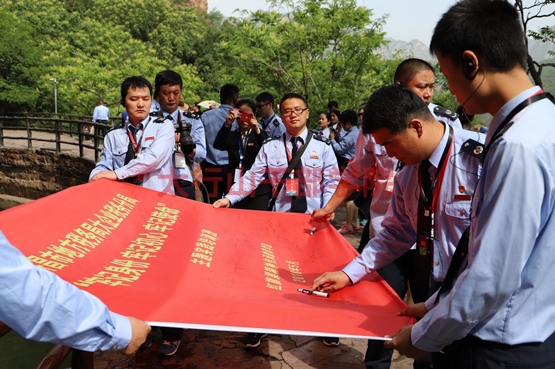 學(xué)員們踏上350米的廊橋——“紅飄帶”,來到青年洞洞口。1973年,全國人大常委會副委員長郭沫若親自題寫了洞名。洞口刻有李先念、江澤民題詞。學(xué)員們集體在洞口合影留念,并重溫入黨誓詞